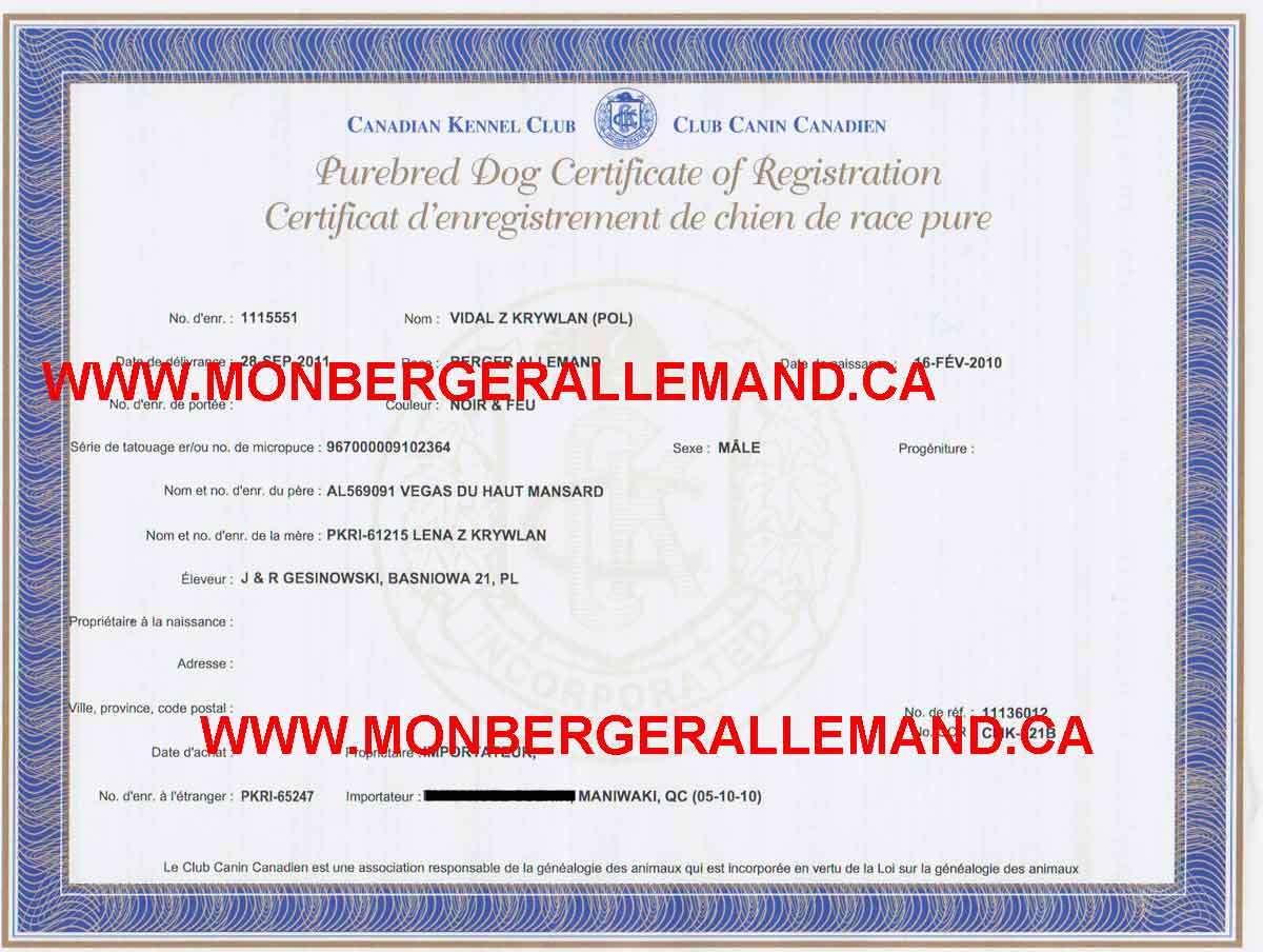 | Nom du Père : 2x VA1 (2008 & 2009) Vegas du Haut Mansard (Double champion du monde 2008 et 2009) | Nom de la Mère : V68 (bszs 2012) VA1(LT) VA3(PL) Lena z Krywlan (Championne de Lituanie et 3ieme meilleur en pologne) | Voir son Pedigree Cliquez ici enr. FCI & CKC |