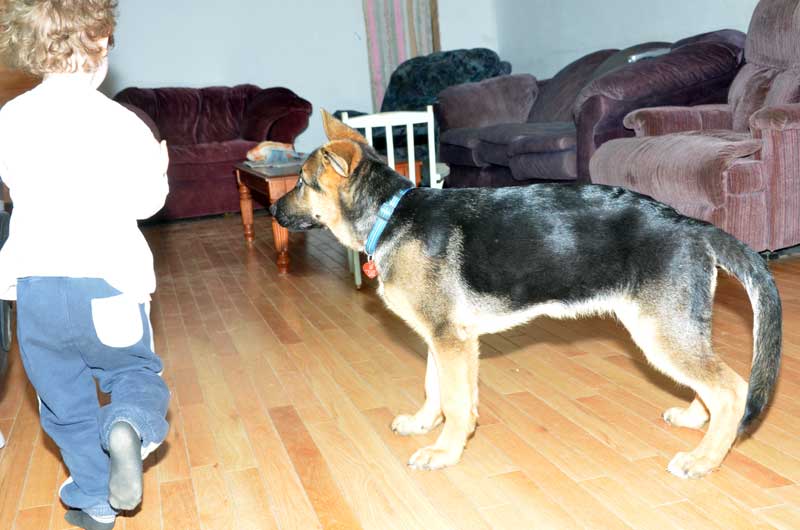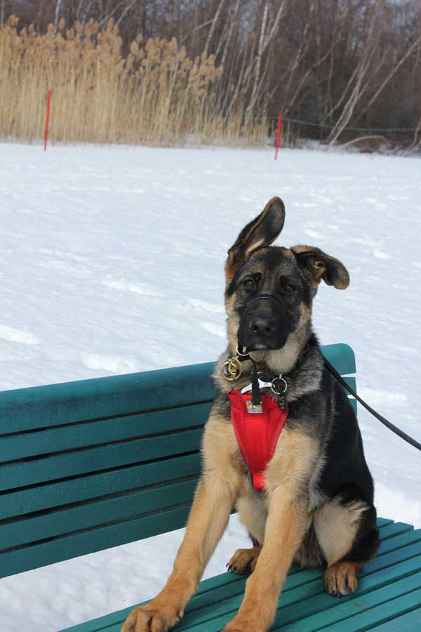 Avec Enzo il faut être très persévérant mais il nous le rend bien, ha oui j'oubliais il est carnivore herbivore boisivore enfin tout ce qu'il peu se mettre dans la gueule il le prend, voilà ce qu'est un berger allemand, nous l'aimons très très fort et lui aussi nous aimes beaucoup. Sur les photos pris en hiver il y à entre 3 mois et demie et 4 mois et celle pris au parc à chien pas de neige il à environ 4 mois et demie. À bientôt