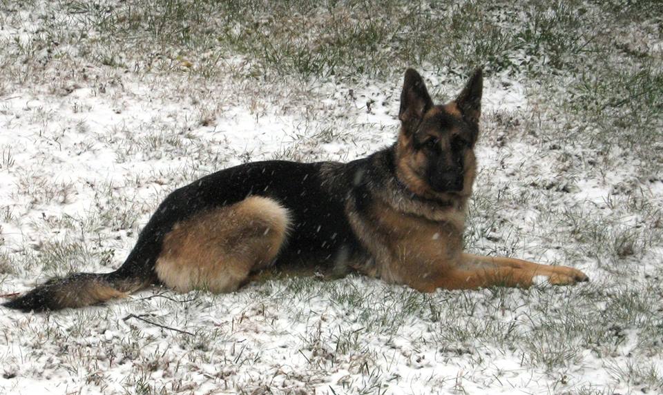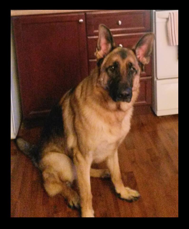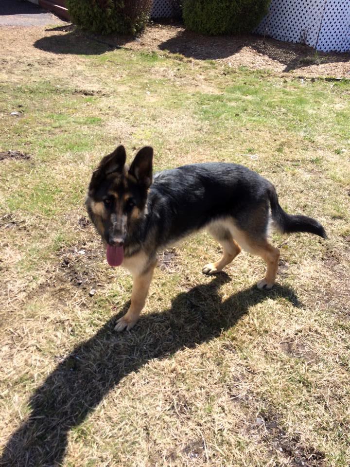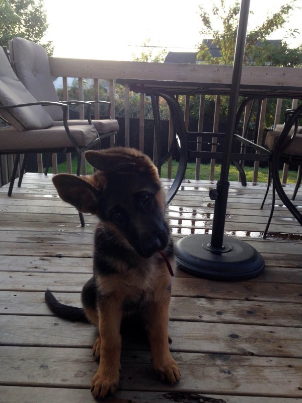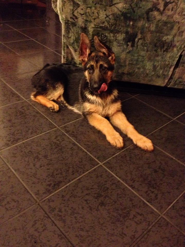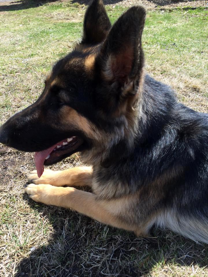Chipper à 14 mois,  il devient de plus en plus obéissant et intelligent. Il fait tourner les têtes c'est incroyable. Son caractère est fabuleux, il est docile avec tout le monde et tous les autres chiens!  Merci beaucoup je n'aurais pas pu avoir un meilleur chien. Chipper est entier et je suis très prudent de ne pas avoir d'accident tout va bien de ce côté et il est facile de le mettre en pose Berger Allemand!  Je vous envoie une photo.